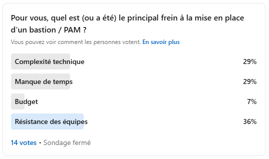 Malgré cette prise de conscience, de nombreux DSI, RSSI et responsables d’infrastructure hésitent encore à déployer une solution de Privileged Access Management (PAM). Non pas par manque d’intérêt, mais en raison de freins bien identifiés : complexité technique, manque de temps, contraintes budgétaires et résistance des équipes. On le voit d’ailleurs dans notre sondage LinkedIn publié il y a quelques semaines :